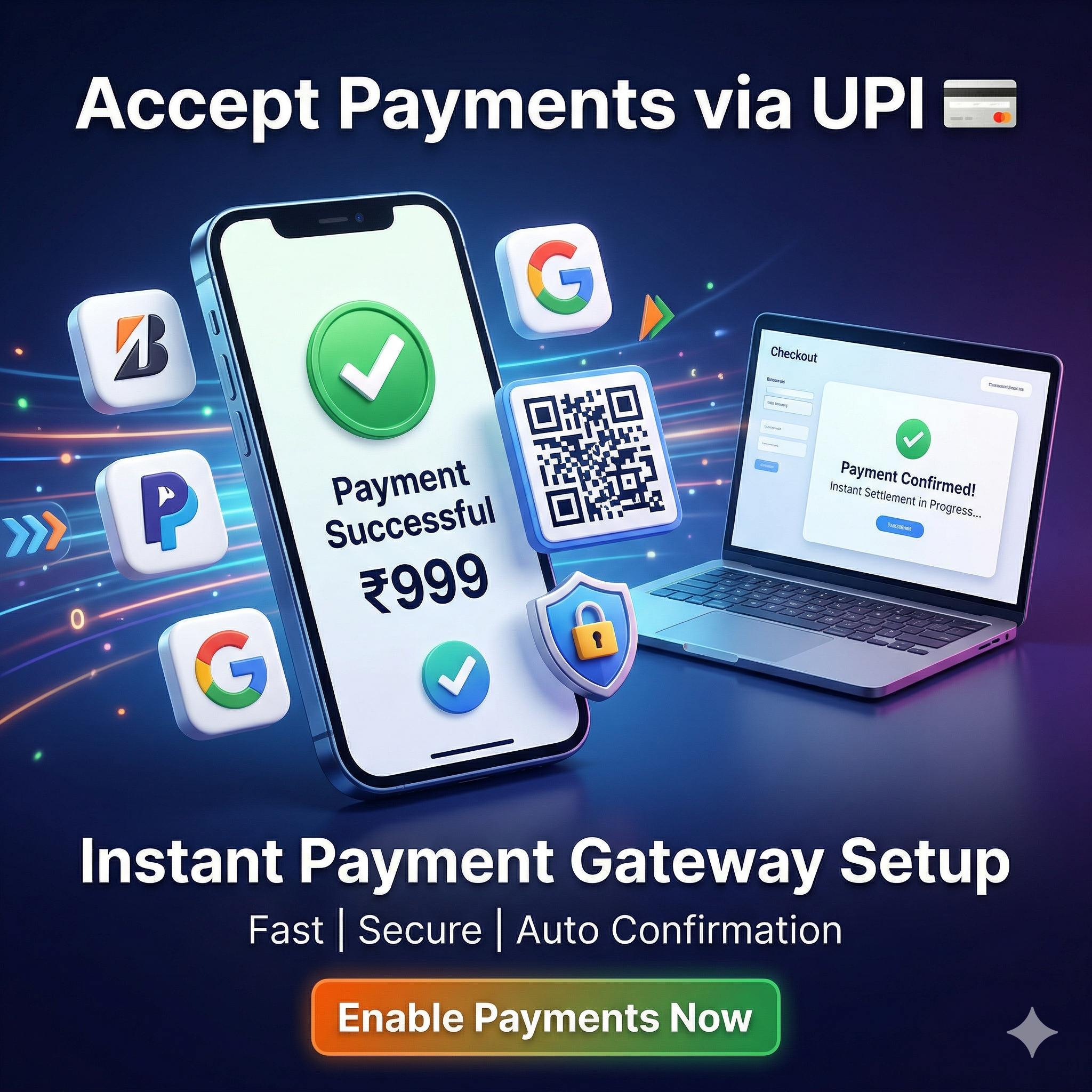 We set up payment gateways like UPI and Razorpay so you can receive payments directly into your account